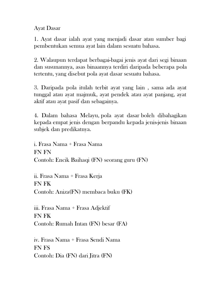 LATIHAN TATABAHASA MENGENAL PASTI JENIS FRASA DAN POLA AYAT. Dengan kata lain ayat dasar ialah ayat yang paling sederhana. FN FN frasa nama frasa nama FN FSN frasa nama frasa sendi nama FN FA frasa nama frasa adjektif FN FK frasa nama frasa kerja.